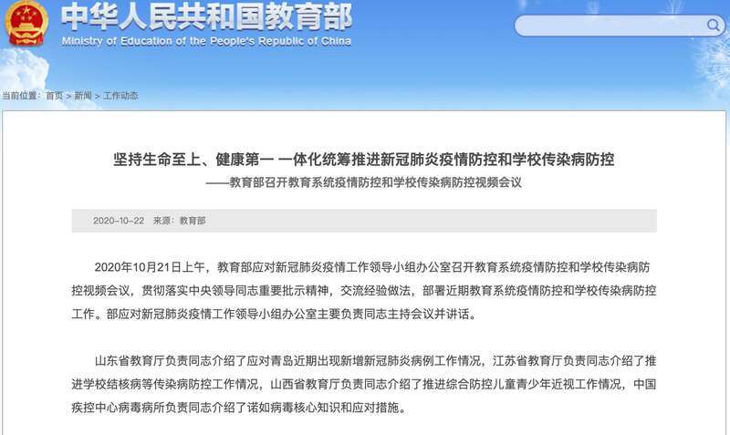 记者从教育部官网获悉,10月21日,教育部应对新冠肺炎疫情工作领导小组办公室召开教育系统疫情防控和学校传染病防控视频会议,部署近期教育系统疫情防控和学校传染病防控工作。