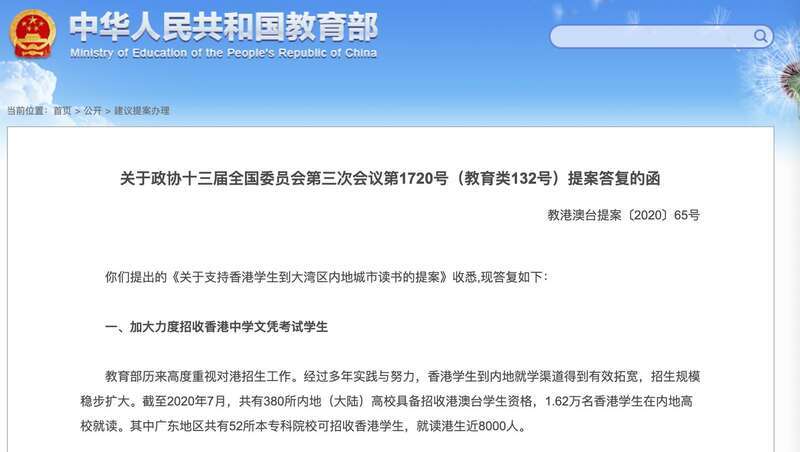 教育部在答复中表示,教育部历来高度重视对港招生工作。经过多年实践与努力,香港学生到内地就学渠道得到有效拓宽,招生规模稳步扩大。截至2020年7月,共有380所内地(大陆)高校具备招收港澳台学生资格,1.62万名香港学生在内地高校就读。其中广东地区共有52所本专科院校可招收香港学生,就读港生近8000人。